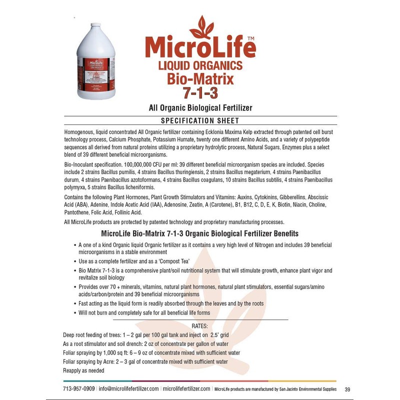 MicroLife Bio-Matrix (7-1-3) Professional Grade Liquid Organic Biological Fertilizer, 1 Gallon