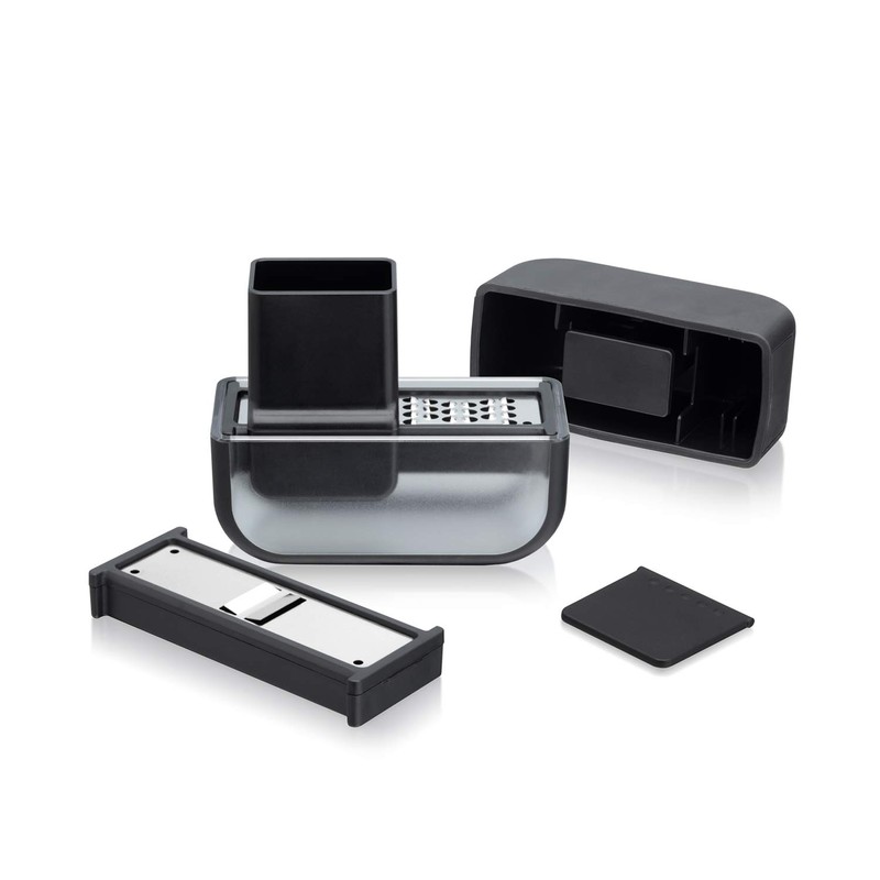 • This set includes a slicing blade and a mincing blade that are interchangeable into the plastic housing