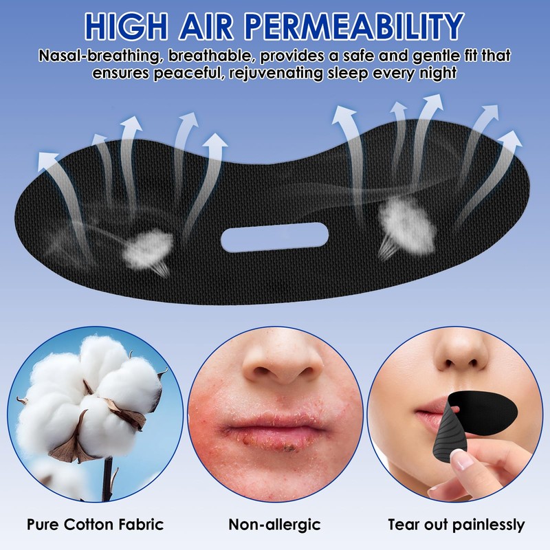 - Weiches, Hautfreundliches Material: Das Mundband besteht aus einem weichen, atmungsaktiven Gewebe und verwendet eine gebogene Klebetechnologie, die eine ausgezeichnete Elastizität und Komfort bietet. Es passt sich perfekt an Ihr Gesicht an und sorgt dafür, dass Sie eine angenehme und störungsfreie Nachtruhe genießen können.
