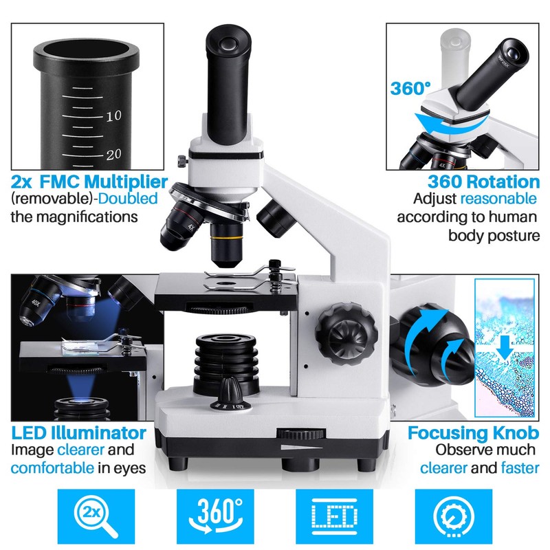 - 🔬【Powerful Magnification】 Monocular tube built-in 2x FMC multiplier lens(removable) and WF25x eyepiece with optical lens,cooperate objective lenses(4x 10x 40x),360 degree rotatable monocular head provide the magnification settings 100/250/1000x, 200/500/2000x -(2x Multiplier in)