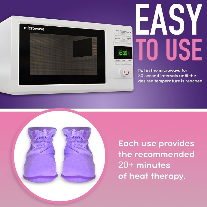 - FOOT WARMERS - If your feet get cold easy, and are often either numb or painful, these booties are perfect for you. The outside is velour, the inside is soft fleece, our microwavable foot warmers are great for warming up your cold feet. Relax on the couch or in bed and put your feet up. Just give these booties a quick spin in the microwave and they're ready to go.