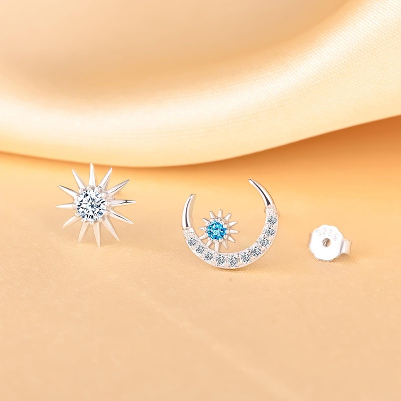 - [Earrings Size] Asymmetric 925 silver stud earrings size: moon: 10 mm x 9 mm, sun: 9 mm x 9 mm; ensures a perfect fit for any type of ear lobe. Simple and classic design, classic and timeless. With these cubic zirconia stud earrings made of sterling silver, you will be more beautiful and elegant.