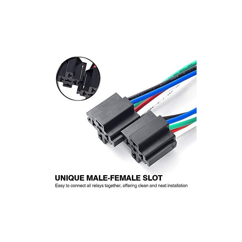 - Easy cable connection: the relay sockets come with colour-coded cables for convenient wiring of loads/accessories. Black - Ground (85), Red - VDC (30), White - Trigger (86), Blue - Output N/O (87).