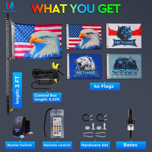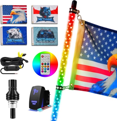 MICTUNING 1PC 3FT LED Whip Light RGB+IC Chasing Colors, w/ Remote Control, Rocker Switch & 4 Flags, Spiral Antenna Whips IP68 Waterproof, for ATV UTV RZR Can-Am