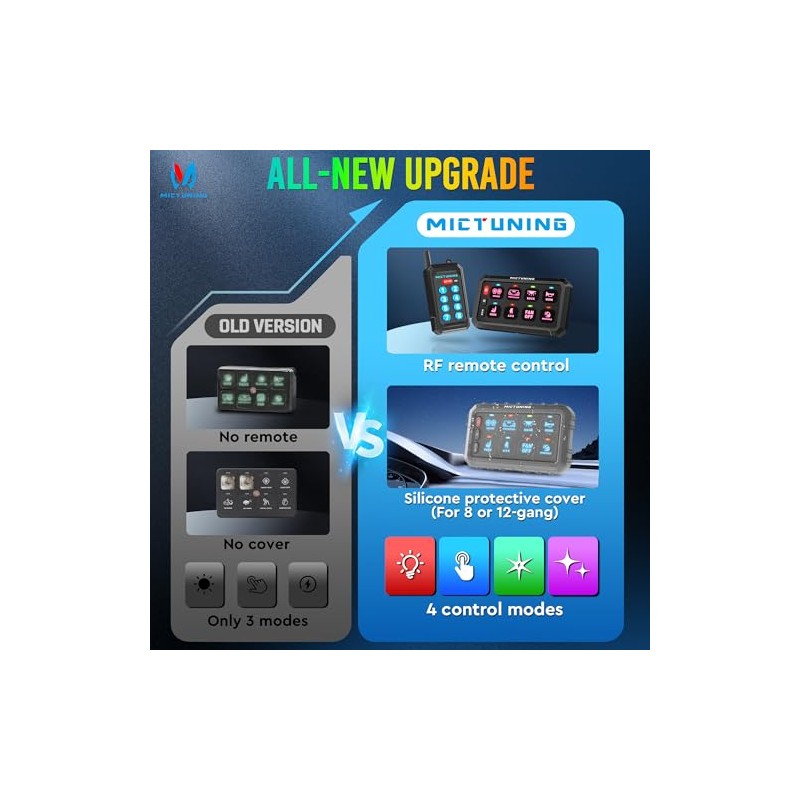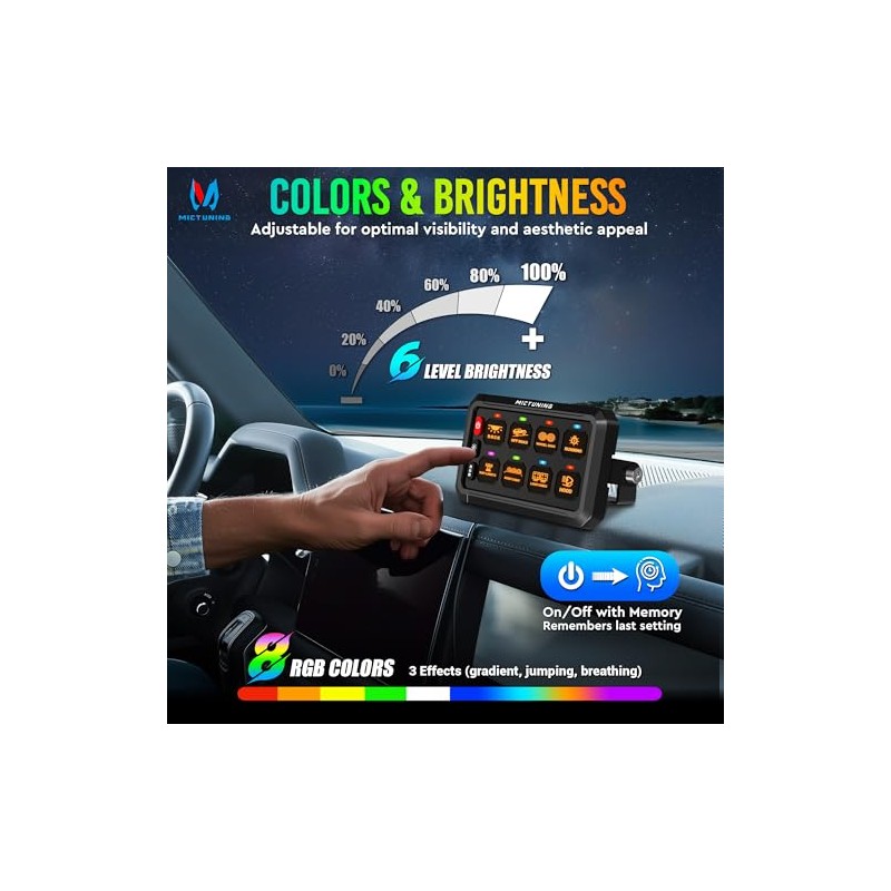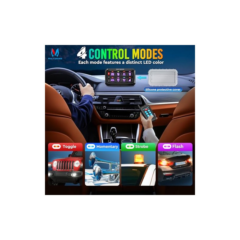 MICTUNING MICTUNING P1Y RGB 8 Gang Switch Panel with Remote Control, Multifunction Toggle Momentary Strobe Pulsed Switch Pod Backlit Off 6 Level Brightness Silicone Cover Circuit System Box for Truck RV Boat