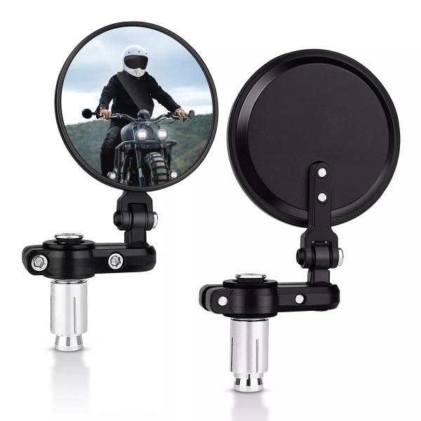 √ Standard 7/8" (22mm) Universal Motorcycle Handle Bar Side Mirrors. √ 3-Inches Round Mirrors with Convex Glass Lens, Super Clear and Wider Visibility. √ 360° Swivel Connection Joint, Flexible Adjustment for The Best Viewing Angle. √ CNC Machined Aluminum Alloy Housing, with Premium Black Finish √ Easy to Install, Direct Clamp-on without any Modification. √ Fit for any Motorcycles, Street bikes, Sports, Chopper, Cruiser with 7/8" Standard Handlebars Package Included