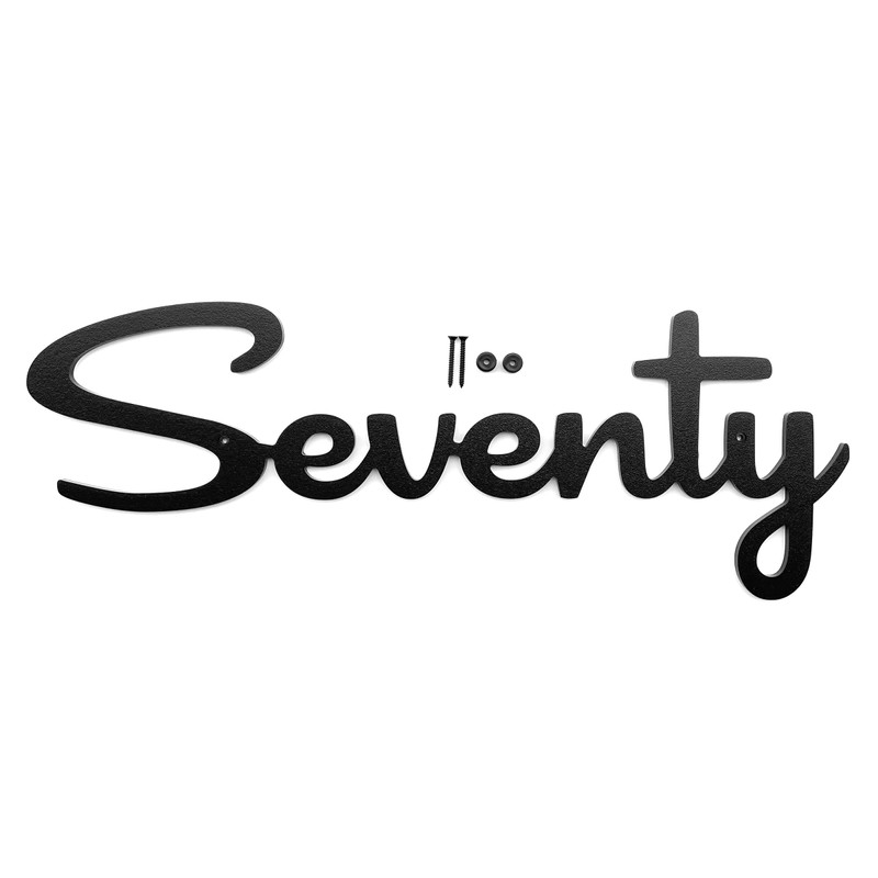 Mid Century Modern Cursive House Numbers, 5 inch black plastic MCM script address words with stainless steel screws included (Seventy)