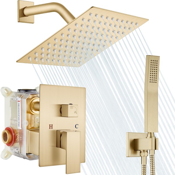 Midanya Rain Shower System Square Rainfall Shower Head Wall Mount Shower Faucet Set with Hand Sprayer Rough-in Valve Trim Kit Bathroom Mixer Shower Combo Set,8 Inch Square Knob,Brushed Gold
