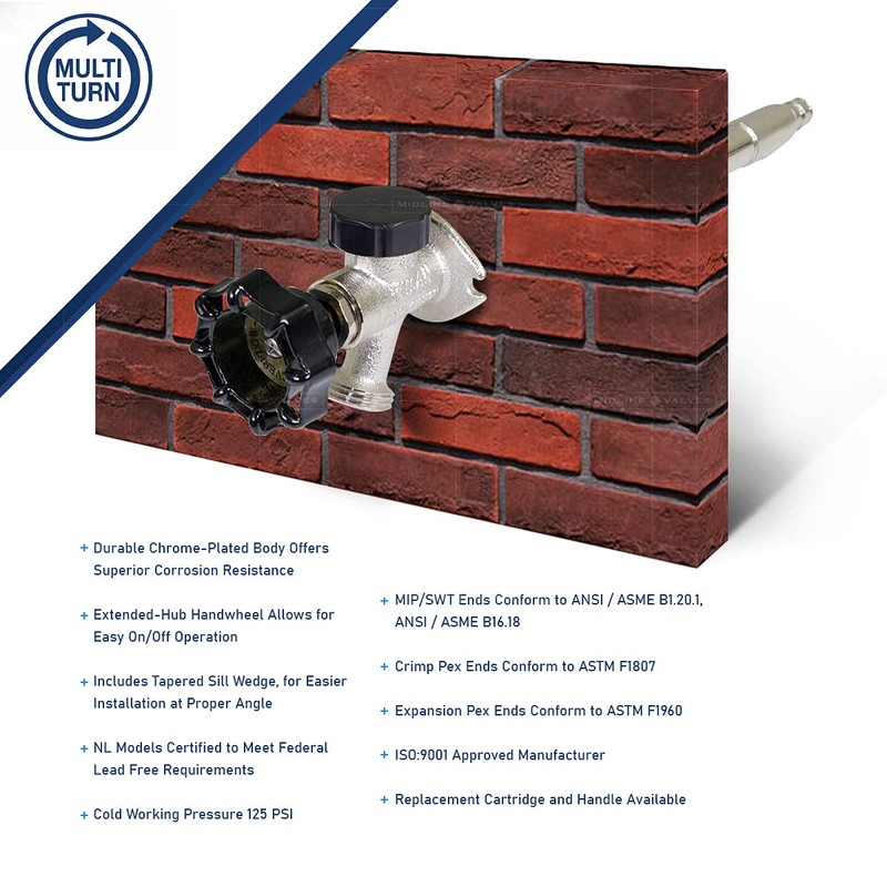 Midline Valve 62081G-OM Anti-Siphon Sillcock Frost Free Outdoor Faucet with Vacuum Breaker 1/2 in. PEX A x 3/4 in. Hose Bib, 8 in. Long, Chrome