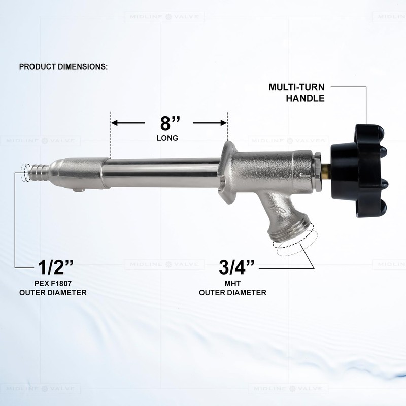 The 8 inch sillcock pipe with chrome plated brass body construction designed to be freeze proof prevents the water in the pipe from outside faucet becoming frozen. The silcock pipe is a spigot that is attached to the exterior of the house and can be connected to hoses. The large and comfortable plastic hand wheel valve turns in either direction for on and off operation to control the flow of water supply. The frost free silcock pipe length is measured 10 inches long with 1/2 inch pex connections for water supply. The hose bib under teh valve has a 3/4 inch male hose thread (MHT) that can be attached with a hose for water supply flow. The pipe is rated for presssure use of up to 150 PSI for water, oil and gas (WOG).