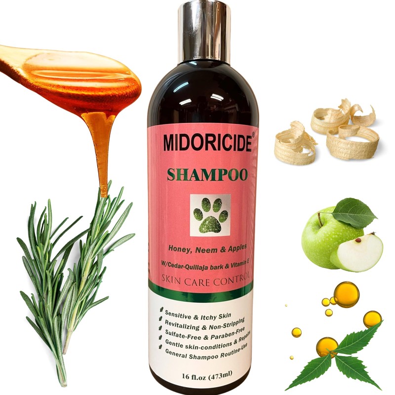 - NATURAL NOURISHING INGREDIENTS Midoricide skincare control shampoo using natural ingredients like organic neem oil, neem leaf extract, organic apple cider vinegar, cedarwood oil, honey, quillaja bark extract, rosemary oil, organic baobab oil and Aloe vera