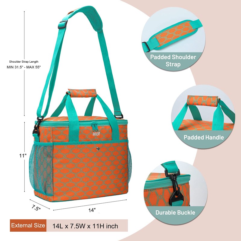 - Large Cooler Bag ---- Huge, not only in size but also in capacity. Exterior size: 14"L*7"W*11.5"H, interior size: 13.5"L * 11"H * 6"W, fits 20 can 355ml Cola