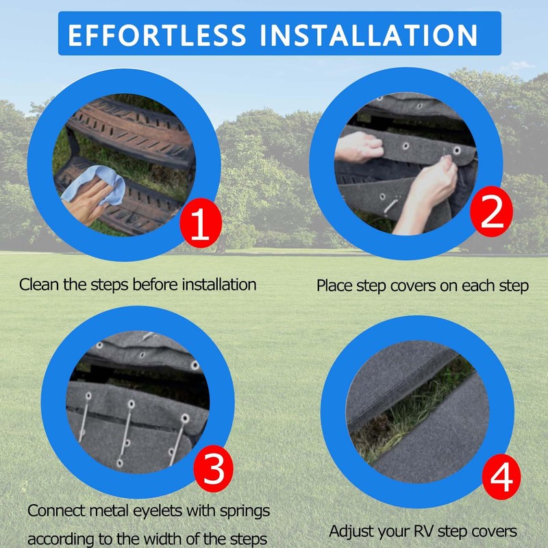 - Easy to Install: Installs in a minute, no tools required. Simply clean the RV steps, place a rv step rug on your RV steps, and attach the spring hooks to the corresponding grommets under the step cover.