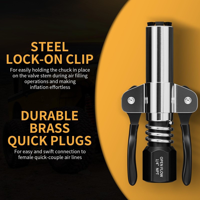 - 【HEAVY-DUTY AIR CHUCK】 Steel lock-on clip for easy attachment to the valve stem during air filling operations, making inflation effortless. Durable brass quick plugs for easy and swift connection to female quick couplers on air lines.