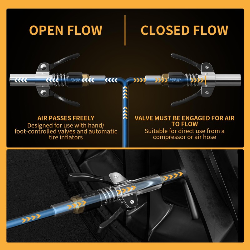 - 【OPEN-FLOW DESIGN】 AIR PASSES FREELY. Designed for use with hand/foot-controlled valves and automatic tire inflators.