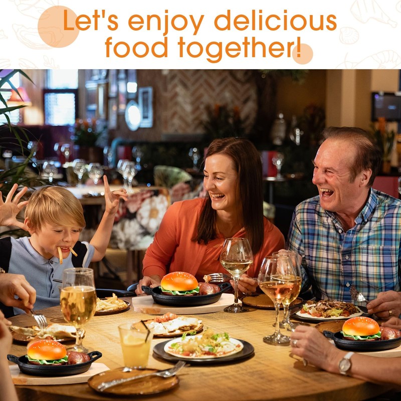 Package Contents: this package comes with 6 sets of sizzling plates with wooden bases, so you can have a consistent look in terms of serving trays during dinner parties or simply have backups ready at hand, maximising your kitchen convenience