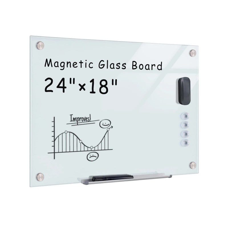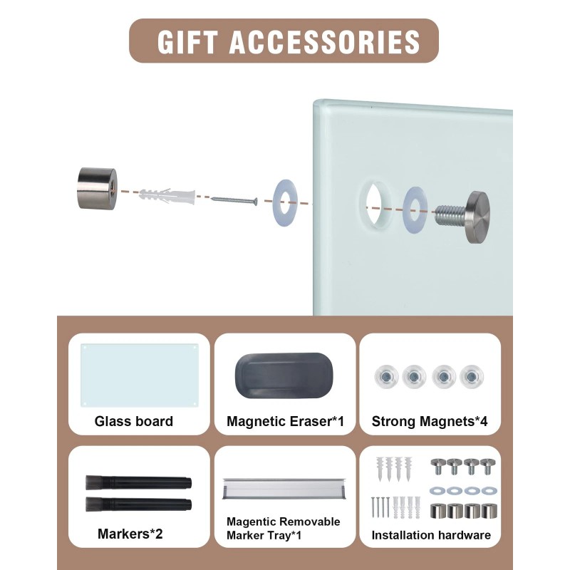 Include Kits: 1 Glass Whiteboard, 4 Magnets, 2 Pens, 1 Board eraser and instruction manual.