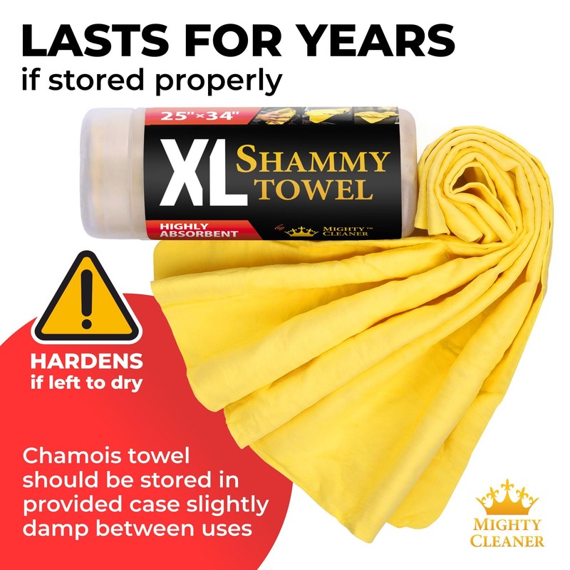 - EXTRA-LARGE SIZE (25x34) We offer the largest chamois cloth for car drying that can be used for an average car, and large-sized vehicles like trucks, or boats. Our XL-sized shammy towel for car can dry even large SUVs in one go!