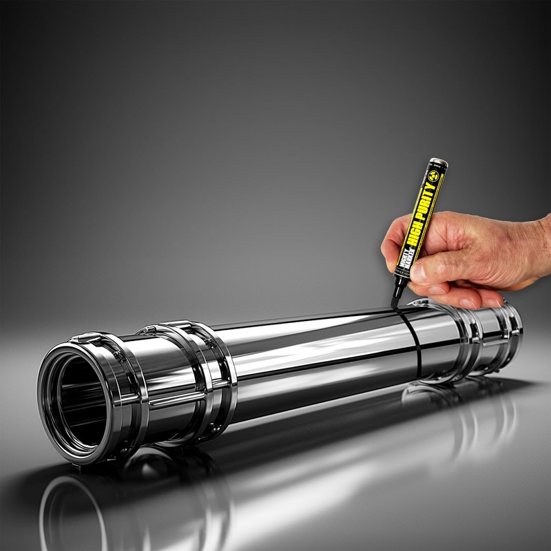 The Mighty Marker High Purity MM-08 Dual Tip Marker is designed for professionals who demand exceptional performance and compliance in industrial applications. Featuring 13ml of lab-tested, high-purity paint, the MM-08 is formulated with low levels of chloride, halogen, and corrosive elements, making it safe for marking stainless steel, titanium, and other exotic materials. The dual-tip design offers versatility with a 3.2mm cone tip for bold, wide lines and a 4.8mm chisel tip for detailed, precise markings. The valve action mechanism ensures the paint remains usable even if the cap is left off and delivers consistent flow for efficient use of every drop. Each marker includes a Certificate of Conformance and lab analysis, confirming compliance with critical standards such as GE D50TF8-S7, Pratt & Whitney PWA 36700, and Rolls Royce EMS 56752. Proudly Made in the USA, the MM-08 is the largest capacity marker in the High Purity family, delivering durable, precise, and compliant markings for professionals in nuclear, aerospace, and other demanding industries. Choose the Mighty Marker High Purity MM-08 for reliability and exceptional performance in critical environments.
