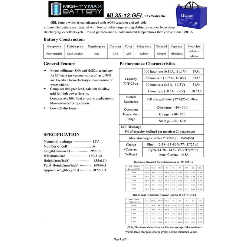 - ML35-12GEL is a 12V 35AH GEL rechargeable maintenance free battery. Pack of 2
