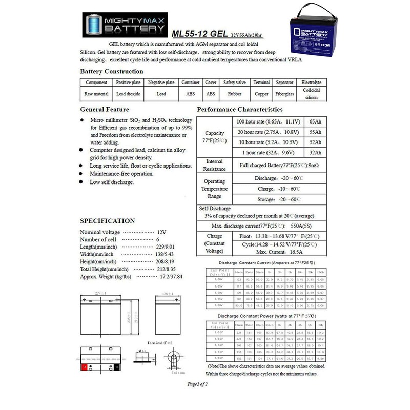 - ML55-12GEL is a 12V 55AH GEL rechargeable maintenance free battery - UL Certified