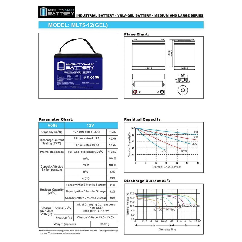 - ML75-12 GEL is a 12V 75AH GEL rechargeable maintenance free battery - UL Certified