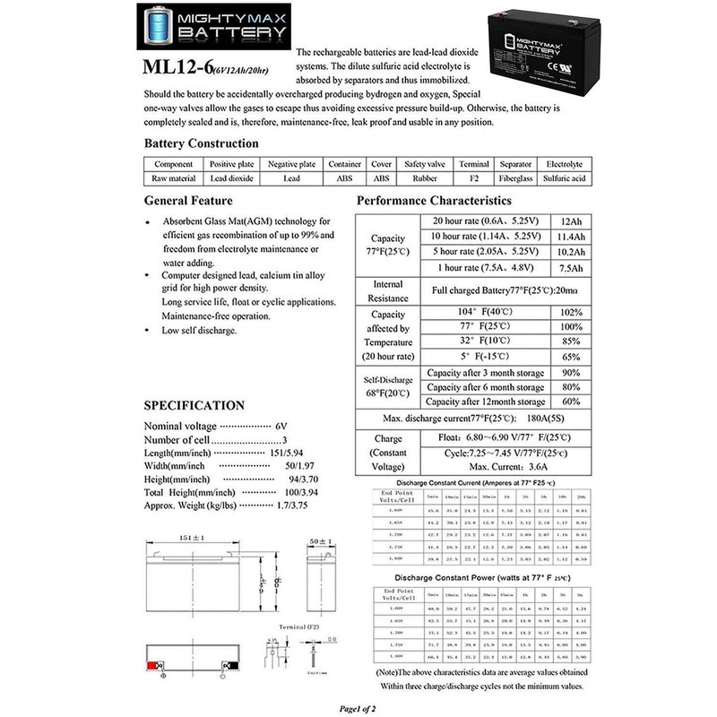 • ML12-6F2 SLA is a 6V 12AH Sealed Lead Acid (SLA) rechargeable maintenance free battery - UL Certified