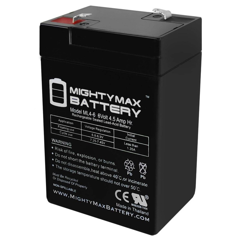 Delivering power when you need it, the Mighty Max ML4-6 6 Volt 4.5 AH uses a state of the art, heavy-duty, calcium-alloy grid that provides exceptional performance and service life in both float and cyclic applications. The ML4-6 is an Absorbent Glass Mat (AGM) technology with a valve regulated design, that can be used in enclosed and indoor environments without leaking or maintenance, providing a superior performance for thousands of models. Mighty Max SLA batteries are utilized in a wide variety of applications including; Consumer Electronics, Electric Vehicles, Engine Starters, Golf Carts, Hunting, Lawn and Garden Tools, Medical Mobility, Motorcycles, Power sports, Portable Tools, Solar, Toys and Hobby, Access Control Devices, Emergency Lighting, Security and more. Specifications: Voltage: 6 Volt Amperage: 4.5 AH Chemistry: SLA, AGM Terminal: F1 Battery Dimensions: 2.76 in x 1.85 in x 4.17 in Weight: 1.83 Lbs Warranty 1 Year Genuine Mighty Max battery Product