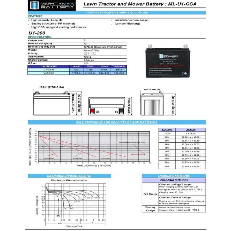 - ML-U1 is a 12V 200 Cold Cranking Amps (CCA) Sealed Lead Acid (SLA) Battery