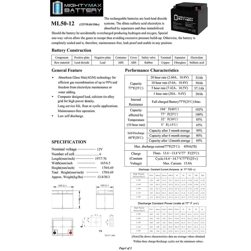 Mighty Max Battery ML50-12 -12V 50AH SLA Replaces ES40-12