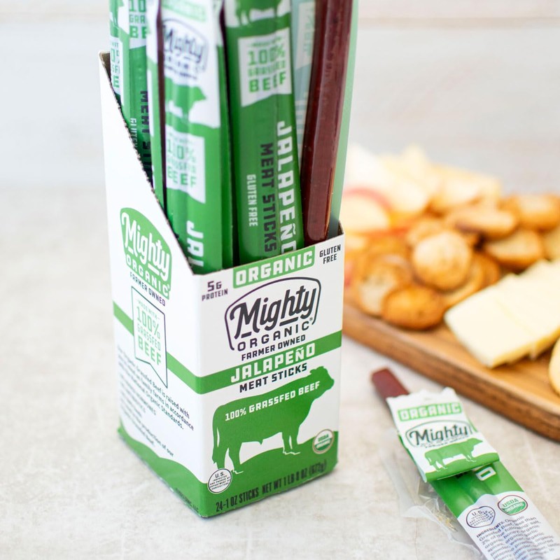 Mighty Organic 100% Grass-Fed Organic Beef Sticks, Jalapeno Beef Jerky Sticks, 24 Pack, 1 oz, Gluten Free Healthy Snacks, Non-GMO