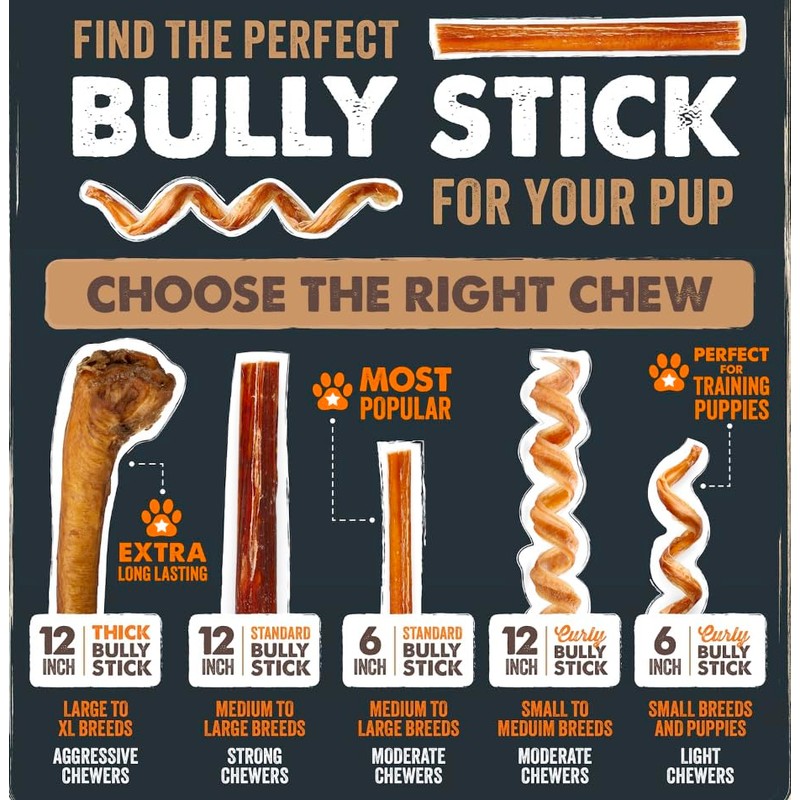 - Anxiety Relief for All Size Dogs: Chewing is a natural dog behavior and offers anxiety relief. That’s why our bully sticks come in 6”, 9” and 12” length variations and 3 different thicknesses: standard, thick and monster. This ensures that light, moderate, and strong chewers can enjoy the bully sticks that are most suited to their individual chewing needs.