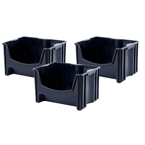 Mighty Tuff Jumbo Stackable Storage Bins, Pack of 3, Easy-Access Storage, Large Easy-To-Grip Handles, Wide Front Opening, Interlocking, Stack Vertically, Black