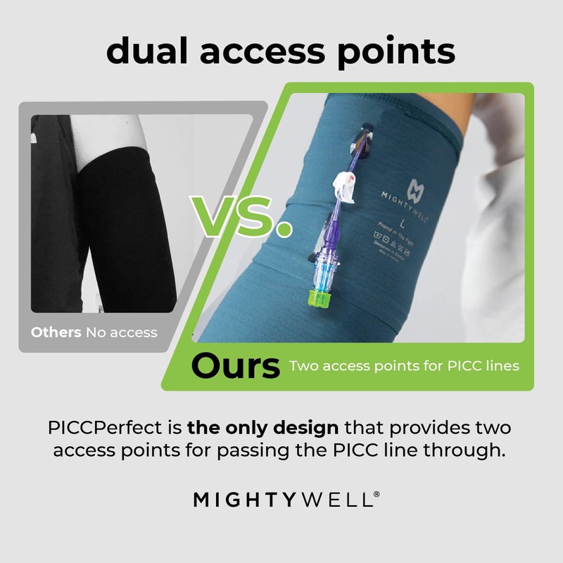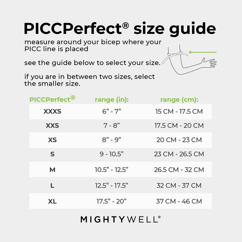 Introducing the PICCPerfect PICC Line Cover by Mighty Well: the ultimate solution for enhancing your daily life with comfort, security, and dignity. Designed with care and expertise by a PICC line user herself, this Boston-born innovation is your ticket to a new level of PICC line cover excellence. Key benefits include: 1. Experience Double Layer Security: Our patented double-layer sleeve design not only covers your PICC line but also provides protection for Midlines, Casts, Wounds, and Dressings. Say goodbye to the hassle of irritating tubing against your skin. PICCPerfect ensures your peace of mind. 2. Best-Rated Design: PICCPerfect boasts the best-rated design for your convenience. Its double access points in the sleeve make it easy to access single and double lumens, allowing for higher or lower placement in your arm. No more exposing your PICC line to curious onlookers; maintain your privacy effortlessly. 3. Soft Touch Fabric for Your Comfort: Crafted with advanced fabric technology, our PICC Line Cover features moisture-wicking and anti-odor properties, ensuring that you stay fresh and comfortable through every adventure. We take the environment seriously, using premium and eco-friendly materials. You won't experience any itchy stitching or thread, and the bonded anti-slip edges prevent the sleeve from slipping down your arm. 4. Don't compromise on comfort, quality, and style when it comes to your PICC line cover. The PICCPerfect PICC Line Cover by Mighty Well is the result of personal experience, innovative design, and a commitment to your well-being. Make your daily life more comfortable and secure; choose PICCPerfect today.