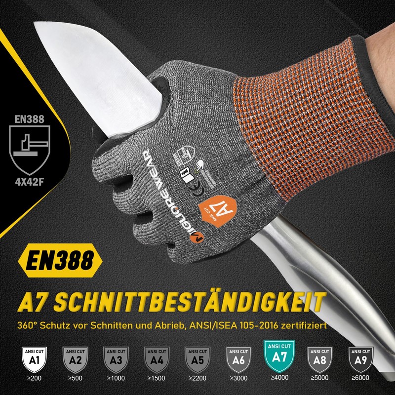 - A7 CUT PROTECTION: these cut resistant gloves are certified according to ANSI/ISEA 105-2016 Level A7 and EN388 4X42F, providing 360° protection against cuts and abrasion, ensuring safety when working with hazardous materials