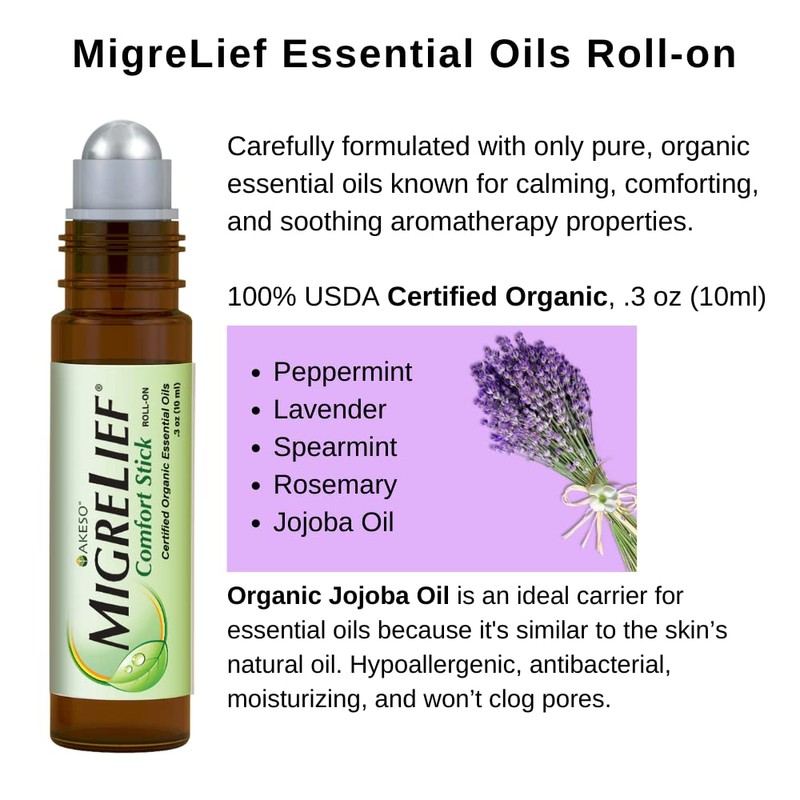 - Fast-acting essential oil therapy: MigreLief Migraine Comfort Stick roll-on is a unique combination of the best calming, cooling, relaxing, organic and pure essential oils including peppermint, spearmint, lavender, and rosemary, in a jojoba oil base providing a simultaneous crisp, invigorating, sweet, floral, and cool mint scent to help you feel relaxed and refreshed. Supports neurological comfort and overall feelings of calm and well being.