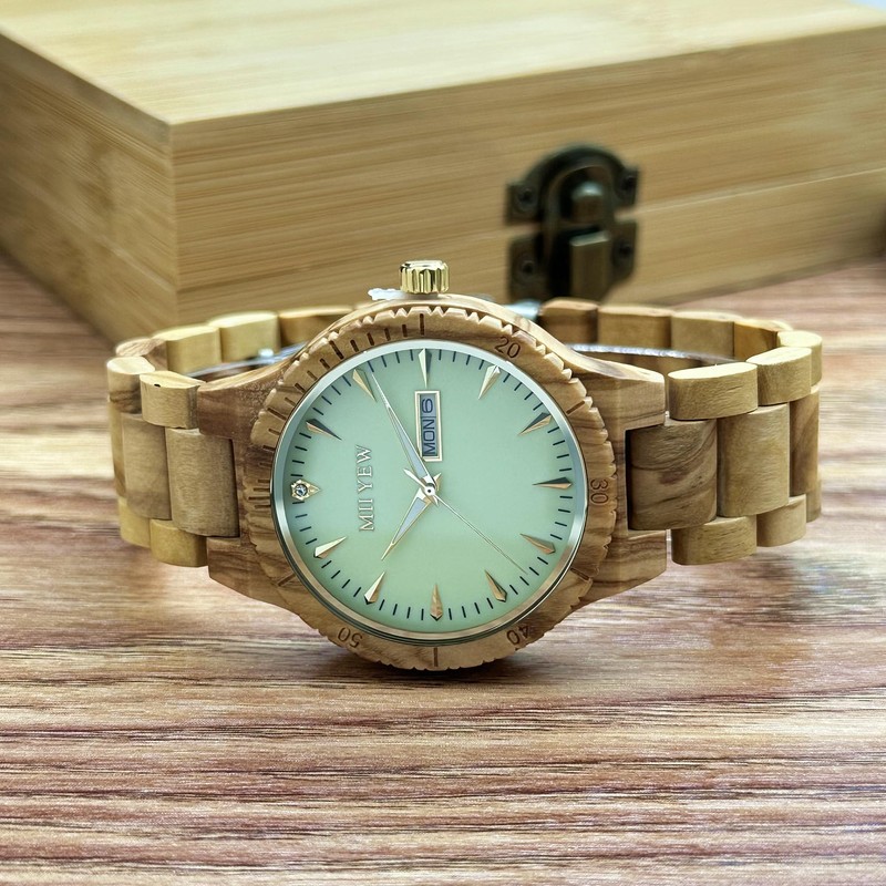 - Olive wood case and strap,light green luminous dial,stainless steel clasp,Luminous hands,Japanese quartz movement show day of the week and calendar and the battery can up to 12-24 months