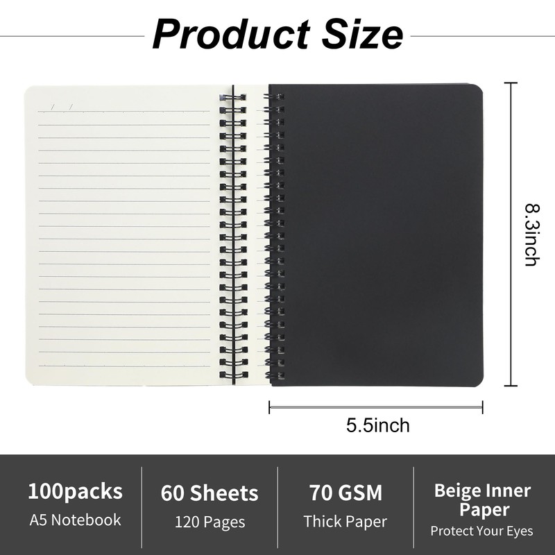 miikoul 100 Packs A5 Spiral Notebooks, Black Ruled Notebooks Bulk, 8.3"×5.5", 60 Sheets/120 Pages, Hardcover Lined Journal Notepad Travel Notebooks for Office and Back to School Supplies