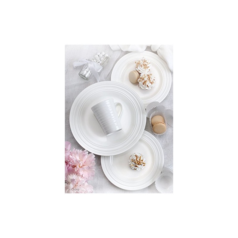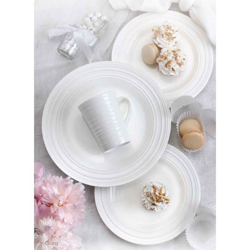 - The Ciara dinnerware collection from Mikasa features embossed, whimsical swirling lines on a crisp white body, creating a striking statement