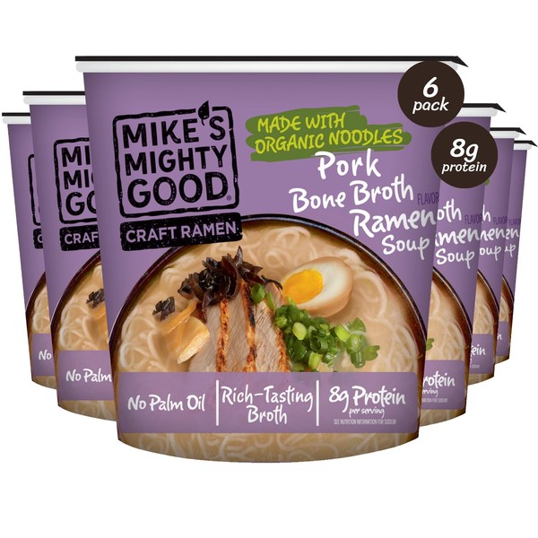 Mike’s Mighty Good Bone Broth Pork Ramen Cup (Pack of 6) – 8g Protein Instant Ramen Noodles – Organic Steamed, Non-GMO - Canola, Vegetable & Palm Oil-Free – Simple Ingredients, Ridiculously Rich Broth