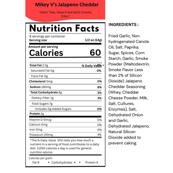 - -Savory Snack: Mikey V's Jalapeno Cheddar Gator Toes are a delicious fried garlic snack. -Crunchy Texture: These bite-sized snacks have a satisfyingly crispy crunch. -Bold Flavor: Packed with the robust flavors of garlic and jalapeno cheddar for a bold and zesty taste. -Portable Packaging: Conveniently packaged in a resealable bag for on-the-go snacking. -Snack Size: Each bag contains a generous portion, perfect for sharing or enjoying as a tasty snack.