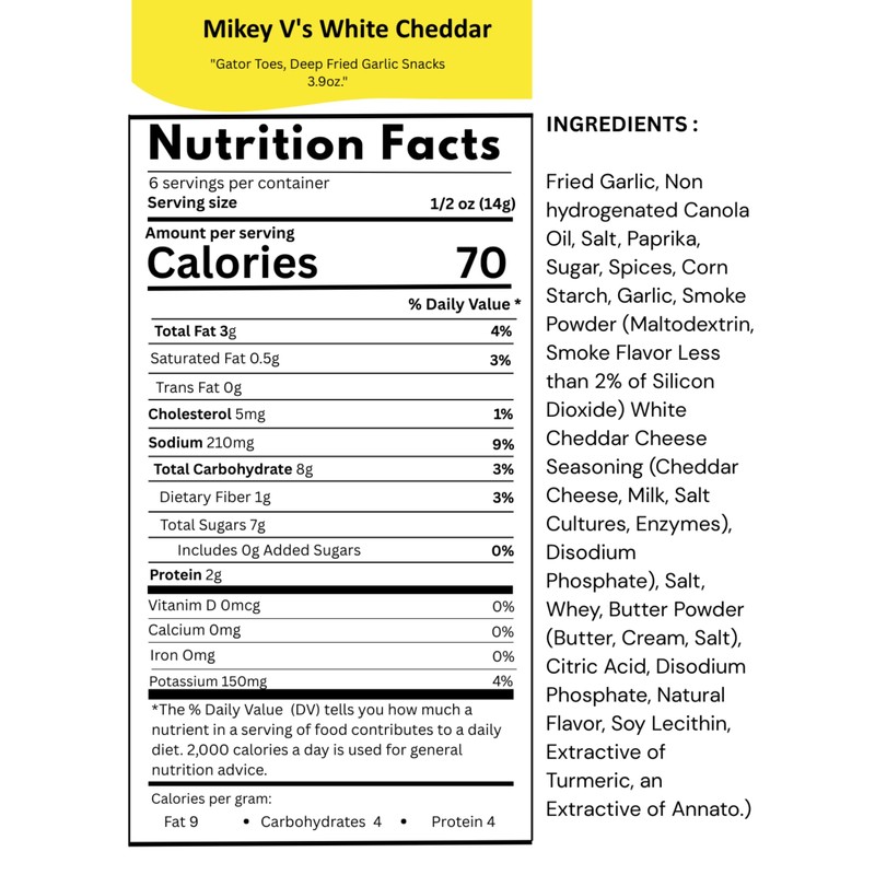 Mikey V's White Cheddar Gator Toes - Fried Garlic Snack (4oz). Looking for a unique, flavorful snack? Mikey V's White Cheddar Gator Toes are deep-fried garlic seasoned to perfection with a rich garlic flavor and a savory white cheddar kick. These crunchy bites are not only a delicious snack on their own, but they also make an excellent crouton substitute for salads, soups, or even as a topping for pasta dishes. Key Features: Bold Flavor: Infused with garlic and white cheddar seasoning for an irresistible taste. Versatile: Enjoy them straight out of the bag or add them to your favorite dishes for extra crunch. Made in Texas: Handcrafted with love in Texas by Mikey V's. Whether you're a garlic lover or just looking for a tasty snack with a unique twist, these fried garlic snacks are sure to satisfy your cravings! Size: 4-ounce resealable bag, perfect for snacking on the go.
