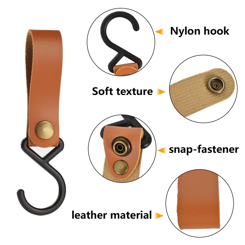 - High Quality Materials The hooks are made of high quality nylon material, while the leather loops are made of durable PU leather. Each leather hook features a sturdy metal snap that ensures the hook stays firmly attached to the bar without falling off. Thanks to their strong compatibility, these hooks can hang various items safely.