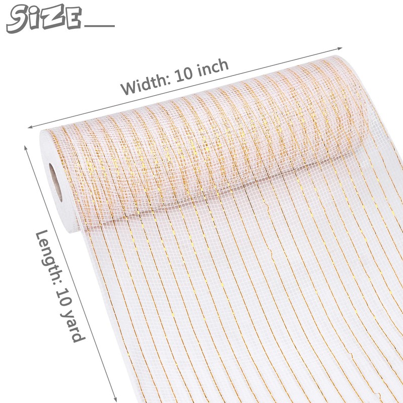 MIKIMIQI Deco Mesh 10 Inch x 30 Feet Decor Mesh Ribbon with Metallic Foil Deco Mesh Wreath Supplies Ribbon Mesh Roll for Spring Wreaths, Swags, Craft, Party Decoration (White Gold)