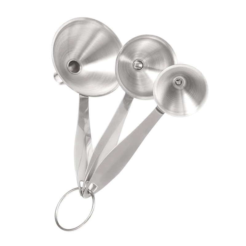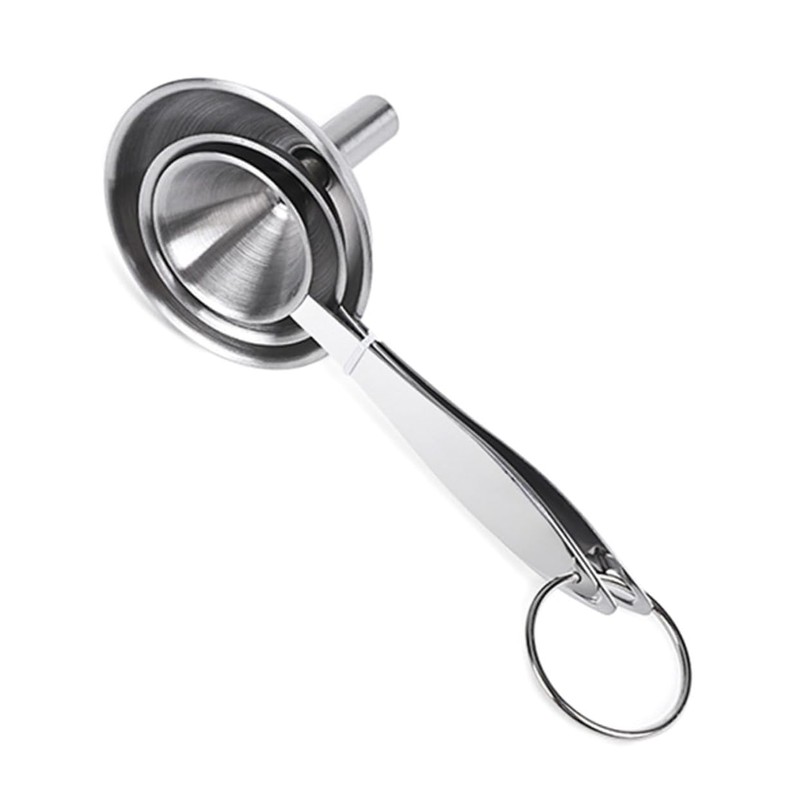 - Stainless steel funnel for bottles: simplicity designed funnels match stainless steel decor. easy clean, dishwasher safe. funnels nest for storage or on ring. dry ingredients funnel
