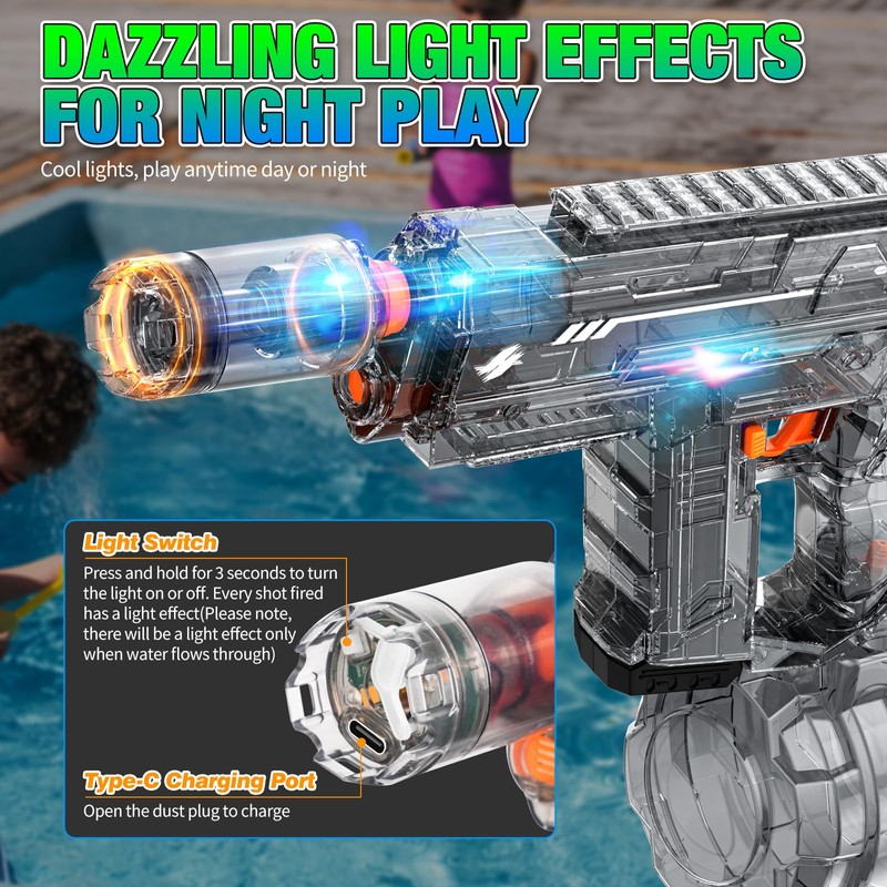 - [Flashing Muzzle & LED Light Effects] This electric water gun features a flashing muzzle and glowing body, adding excitement to your water play, especially in low-light conditions. Great for nighttime water parties. (NOTE: The flashing muzzle lights up when the water flows through it.)