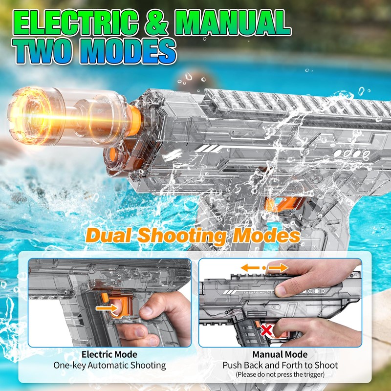 - [Great for Indoor & Outdoor Play] Whether it’s a pool party, backyard or swimming play, or indoor fun, this electric water gun is designed for all water play scenarios for adults and kids.