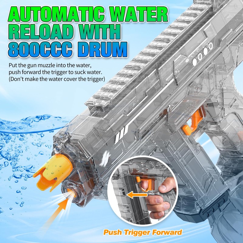 - [Auto Suction & 800CC Large Capacity] Equipped with auto suction technology and an 800CC water drum, this automatic water gun ensures continuous fun without frequent refills. (NOTE: Remove the flashing muzzle before using the auto suction feature.)