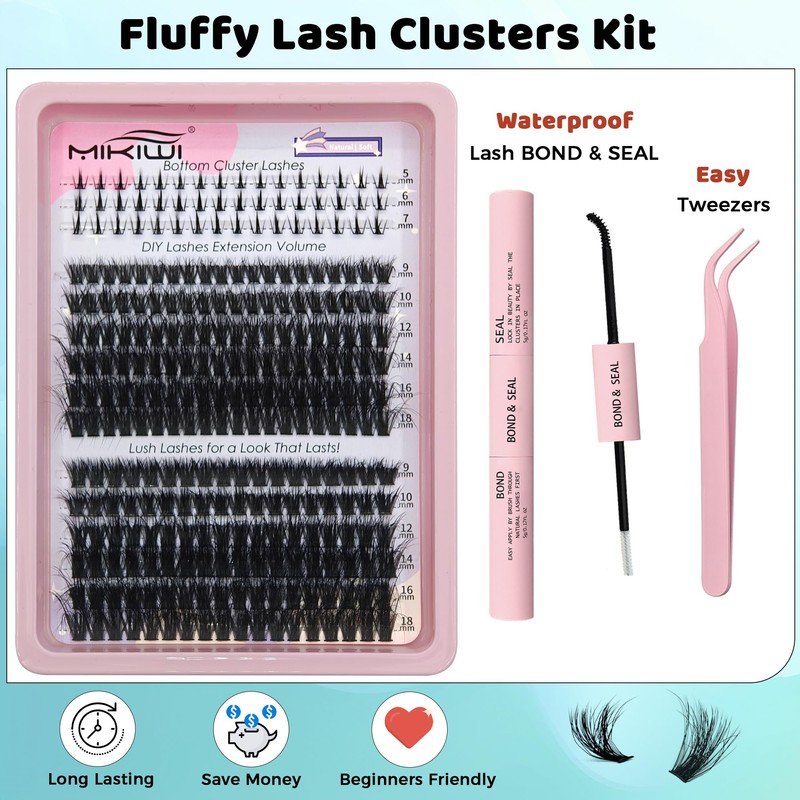 MIKIWI Lash Clusters Kit 9-16mm Fluffy Cluster Eyelash Extensions with Bond and Seal, Lash Applicators D Curl Volume Cluster Lashes with Bottom Lashes(U02+60D+80D)