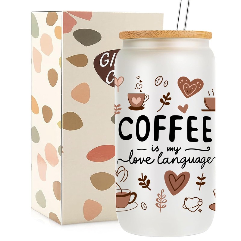 - Coffee Is My Love Language Cup - Celebrate your passion for coffee with this stylish glass cup featuring the playful phrase “coffee is my love language” and surrounded by adorable coffee-themed illustrations. A thoughtful and fun gift for any coffee enthusiast.